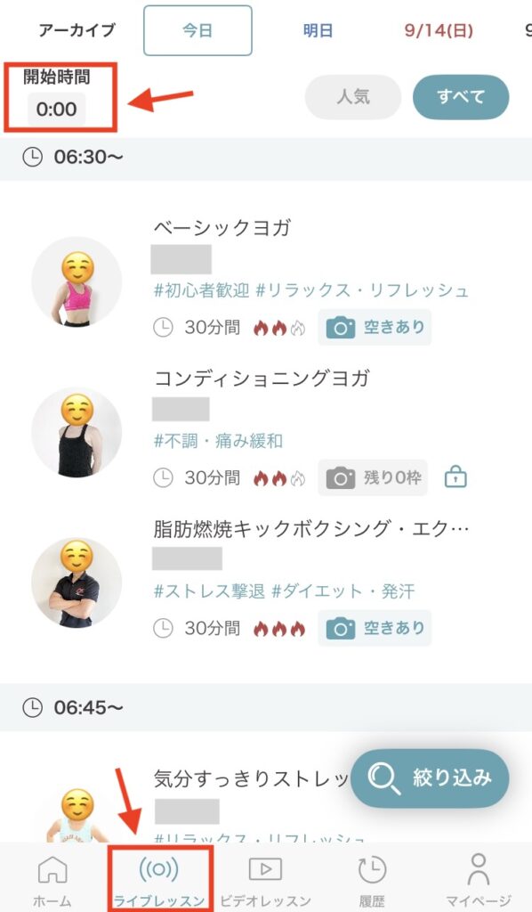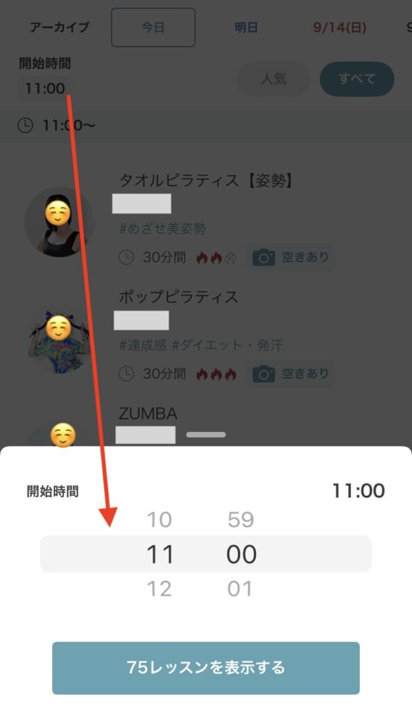 時間を指定すると、その時間に受講できるレッスン一覧が表示されます。